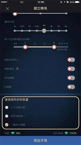 · 在俱乐部内创建牌局时,需要选择同步,完成和目标联盟共享牌局(当俱乐部关联多个联盟时)。每个牌局只可以同步到1个联盟。每次同步牌局需要消耗200钻石。